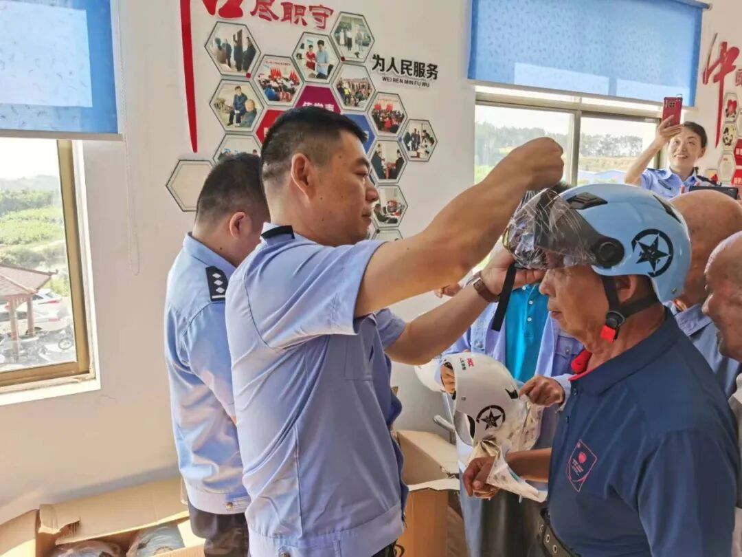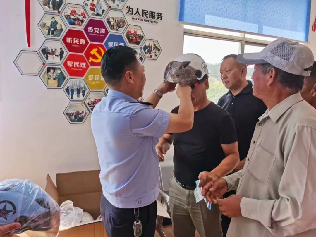 宣讲活动期间,民警先针对村里的‘一老一小’进行了简单的了解,继而结合“美丽乡村行”主题与村民们积极进行现场互动,村民们提出问题,民警们答疑解惑,现场氛围火热。大家认真聆听,入心入脑,积极参与,学习普法知识,话家常一般的展开了讨论。民警还通过发放“一盔一带”主题宣传单、张贴宣传海报、固定宣传栏,进一步加深了村民们交通出行安全意识。随后,详细讲解了在农村道路出行、驾驶摩托车、电动车及农用三轮车的出行标准及规范,着重强调了佩戴安全头盔和系好安全带的重要性,并现场免费给村民们发放安全头盔。与此同时,通过生动形象的讲述,对不规范出行导致的、发生在身边的交通事故案例进行分析,给村民们“提个醒儿”、“敲警钟”。