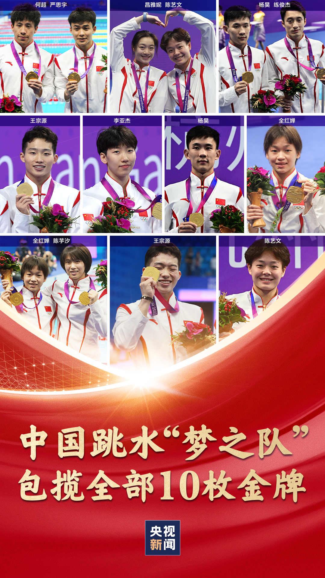 跳水女子3米跳板决赛,陈艺文、昌雅妮分获金银牌。跳水男子10米跳台决赛,杨昊、白钰鸣分获金银牌。至此,中国跳水队包揽杭州亚运会跳水项目全部10枚金牌。