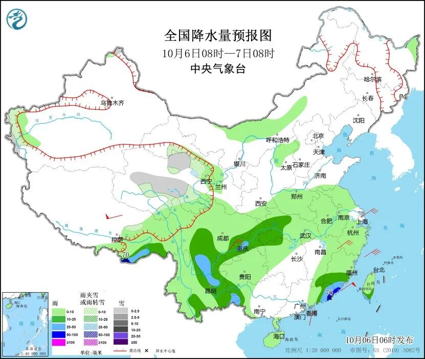 中央气象台预计,6日,新疆西部、青海中部和东北部、甘肃西部等地部分地区有小雪或雨夹雪;西藏东南部、四川南部和东部、重庆、云南东部和南部、贵州南部、湖北西部、广东东部、福建南部以及台湾岛南部等地部分地区有中到大雨,其中西藏东南部、广东东部、福建南部等地局地有暴雨。