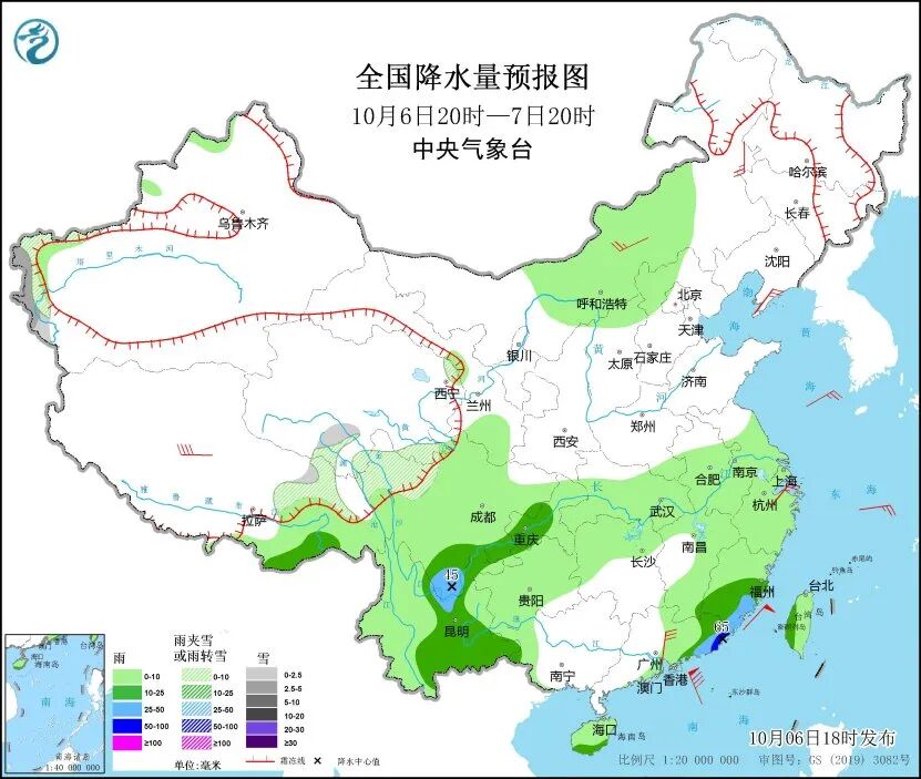 中央气象台预计,6日20时至7日20时,新疆南疆盆地西部沿山地区、青海南部、西藏东部等地有小到中雪或雨夹雪;西藏东南部、四川盆地东部和南部、云南中东部等地部分地区有中到大雨;广东东部和福建南部沿海等地局部地区有暴雨。