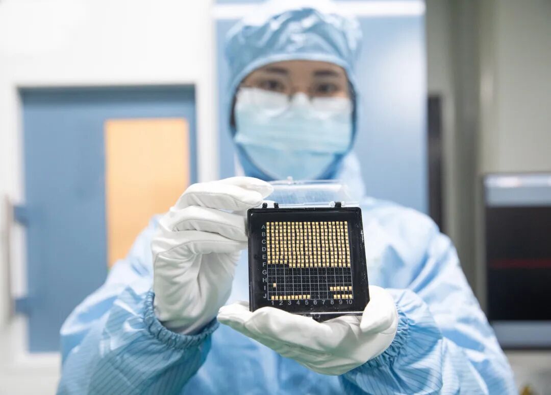 (梁子湖区梧桐湖园区内,湖北赛格瑞新能源科技有限公司员工展示5G温控芯片成品。)