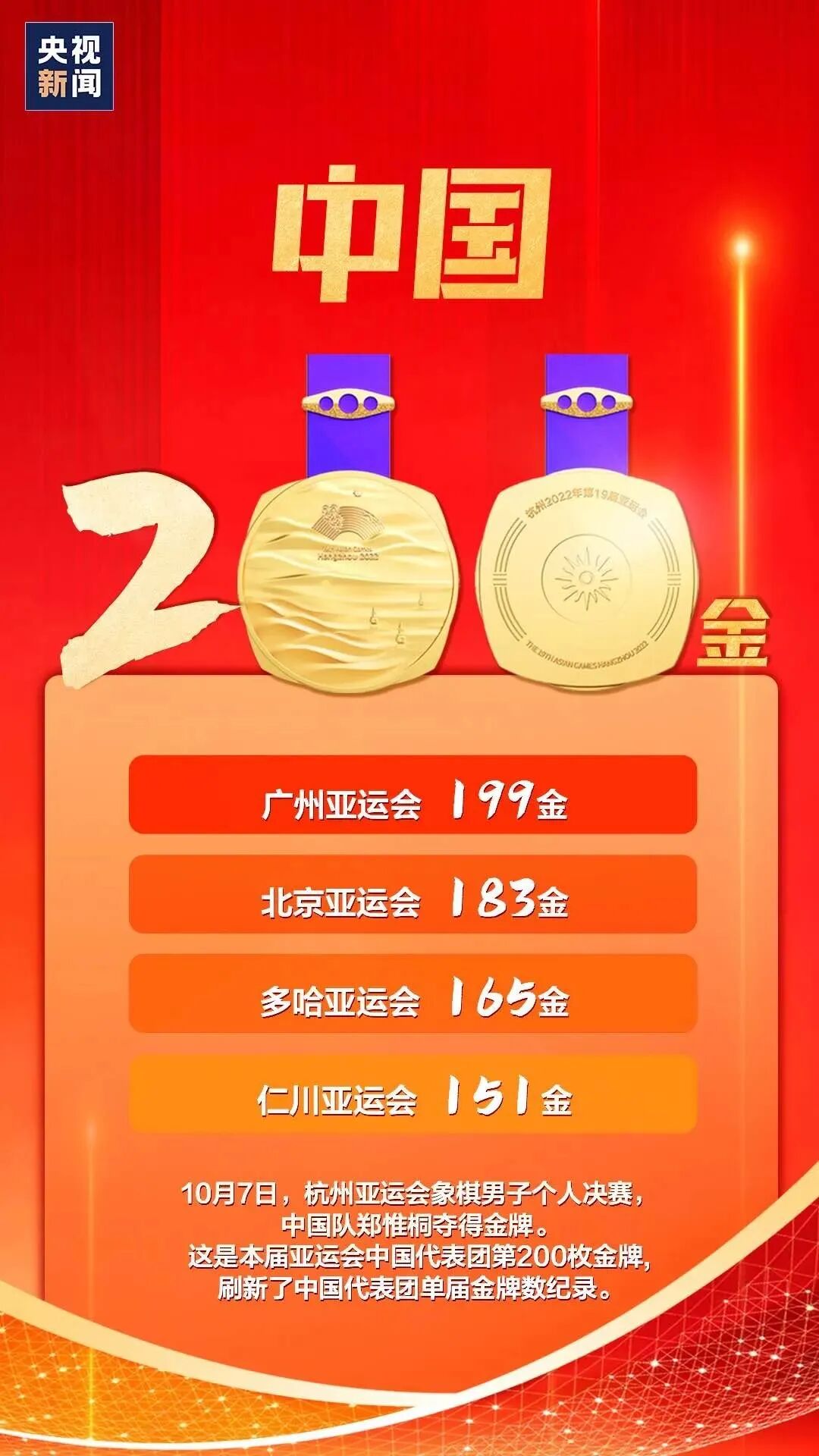 ○斩获金牌200枚 中国队刷新亚运会最好成绩