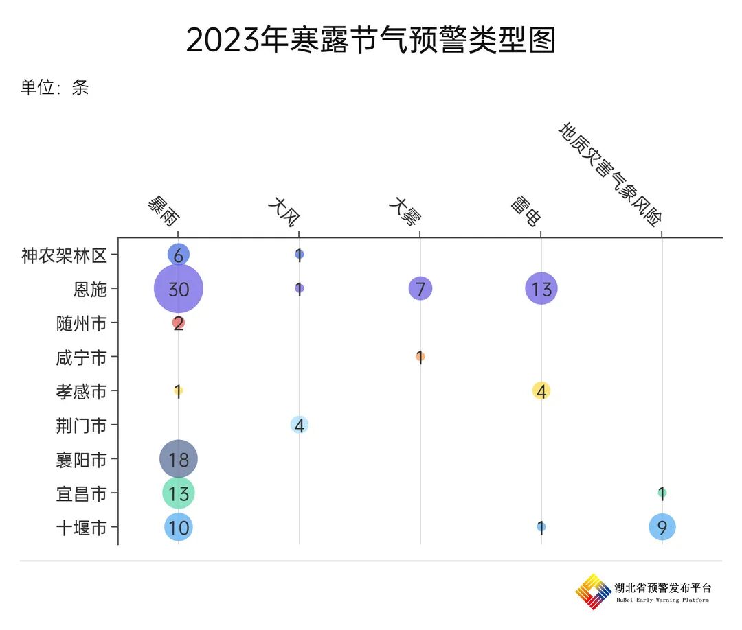 2023年秋分至寒露期间,全省共发布预警信息122条,恩施位居榜首,十堰、襄阳紧随其后。从各地发布灾种来看,受冷暖空气交汇影响,暴雨、雷电预警频发,占比分别为65.6%、14.8%。鄂西北等地出现重度连阴雨,地质灾害气象风险预警发布量相对较高,占比8.2%,需加强防范山洪、滑坡、泥石流等地质灾害对交通安全产生的不利影响。同时冷空气带来的显著降温,对晚稻生长不利,应加强田间管理,采取防御措施。
