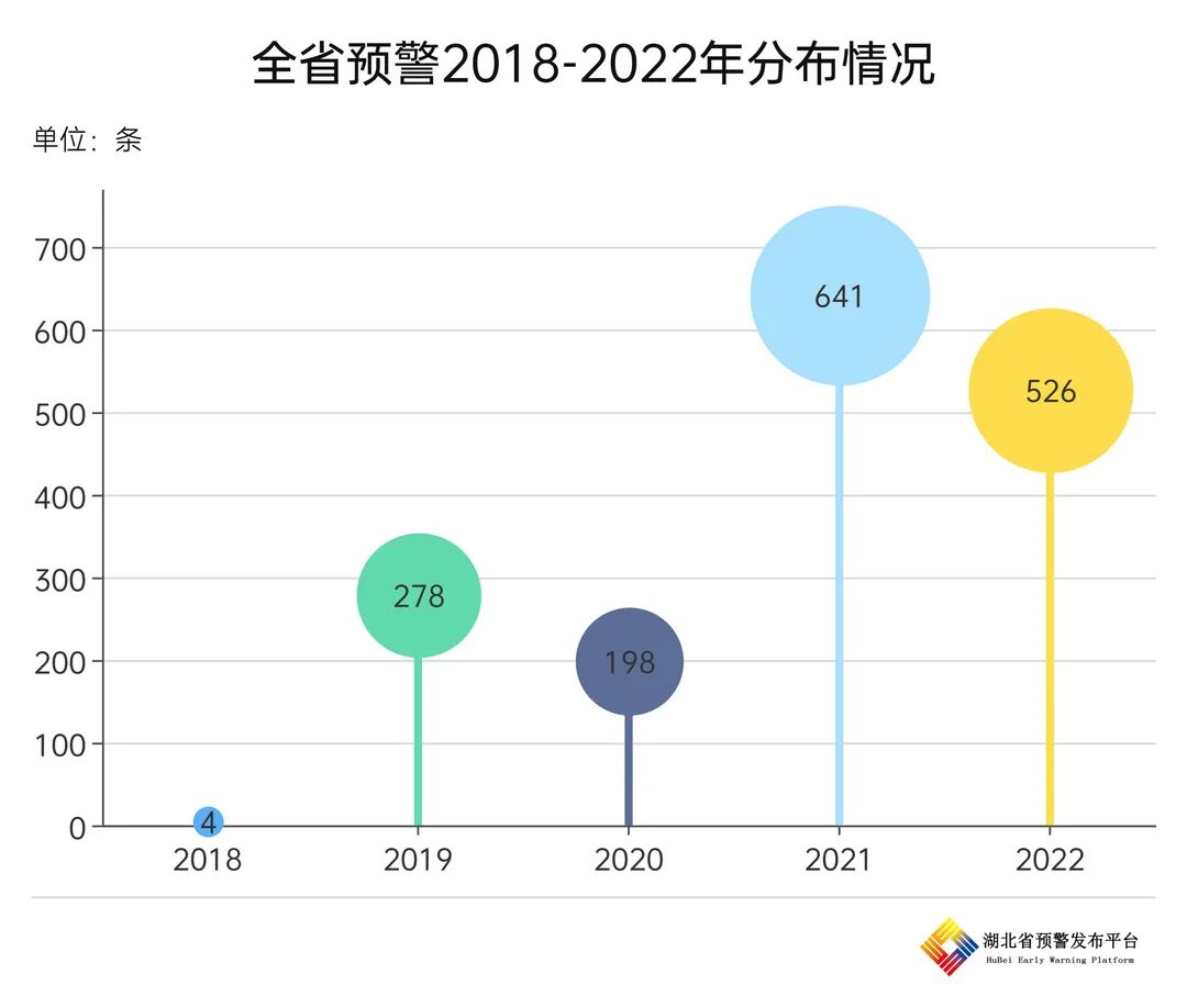 据秋分至寒露期间预警大数据统计分析显示(例如:2022年寒露为10月8日,统计上个节气秋分9月23日 0:00时至10月7日23:59:59期间有效预警数据),近5年全省平均发布预警数量281条,其中2021年发布预警数量641条,为近5年最高峰,比发布量最少的2018年多600余条。