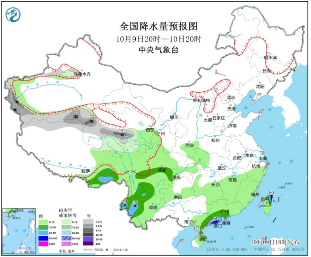 中央气象台预计,9日20时至10日20时,新疆沿天山地区、南疆西部和南部、西藏北部、青海中南部等地部分地区有小到中雪或雨夹雪,局地有大雪;西藏东南部、四川中南部、云南中西部、广东西南部、台湾岛东北部等地部分地区有中到大雨,其中,广东西南部沿海、台湾岛东北部等地局地有暴雨。