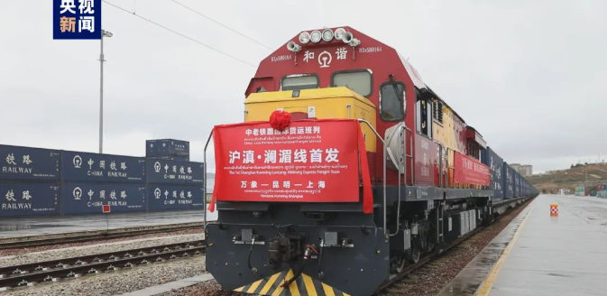 首趟“沪滇·澜湄线”国际货运班列开行首发仪式在云南昆明举行。36车满载来自老挝及东南亚地区的水果等产品的班列,82个小时后到达上海。