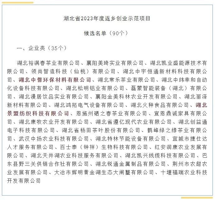 湖北省人力资源和社会保障厅公布了《湖北省2023年度返乡创业示范县、示范园示范项目候选名单公示》,湖北中憬环保材料有限公司、湖北景盟纺织科技有限公司入选“湖北省2023年度返乡创业示范项目”。