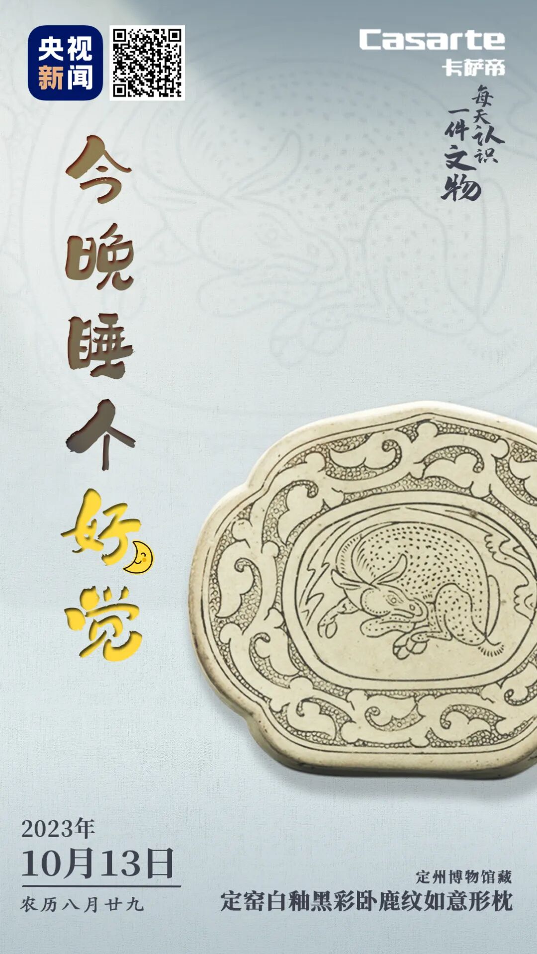 累了一天头昏脑涨,床上躺一躺,这只定窑白釉黑彩卧鹿纹如意形枕,一定是个好选择。陶瓷的质地清凉沁肤,清凉明目;枕身前低后高,中部稍凹,符合人体工程学的设计;加之枕面上的纹饰,营造出睡觉氛围感,这简直是古人的“助眠神器”!