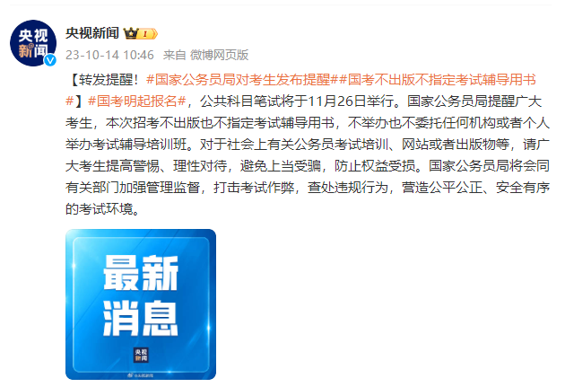 2024年度国家公务员考试明起报名,公共科目笔试将于11月26日举行。