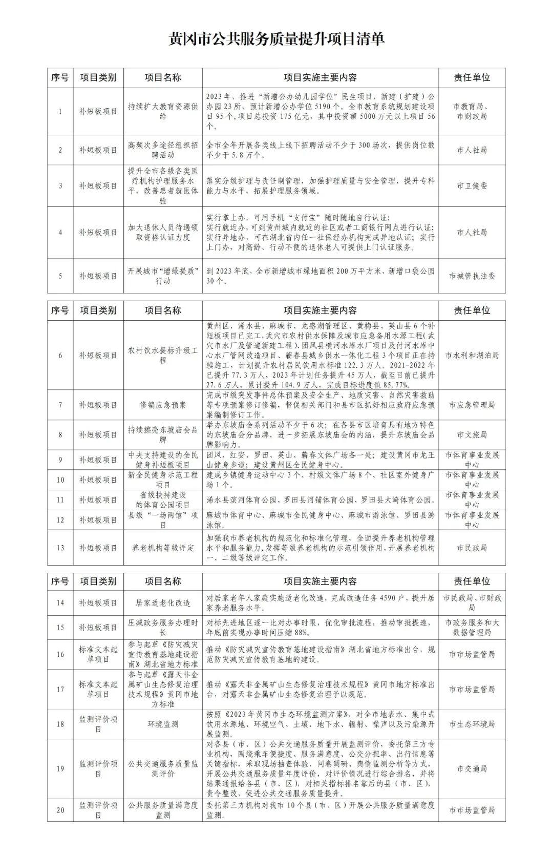 (一)开展公共服务补短板行动。一是补监测反映的短板。针对湖北省公共服务质量监测报告中我市低于全省平均分的领域、低于80分的指标、2023年二季度较一季度得分下降的指标,分析问题原因,制定整改措施,开展整改行动。二是补提升行动的短板。对照《黄冈市公共服务质量提升行动方案》, 对重点工作任务落实情况进行评估,对未落实的措施,未完成的任务,加大工作力度,加快工作进度,推动任务落地落实。三是补改革创新的短板。加强公共服务创新能力建设,推进公共服务新技术新管理新方式应用,提升公共服务信息化、智能化、精准化、适老化发展水平,满足人民群众多层次多样化个性化需求。(牵头单位:市市场监管局;责任单位:各公共服务部门,各县市区人民政府)