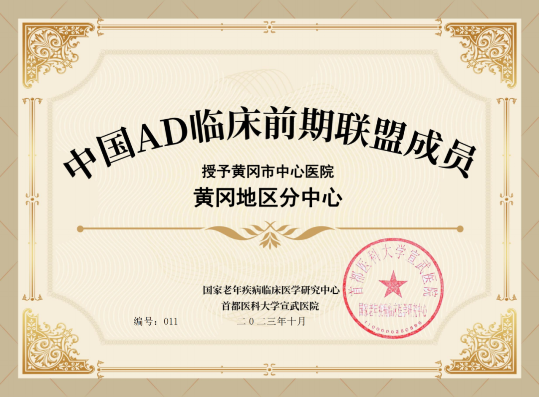 黄冈市中心医院被授予全国第一批中国AD(阿尔茨海默病)临床前期联盟地区分中心。