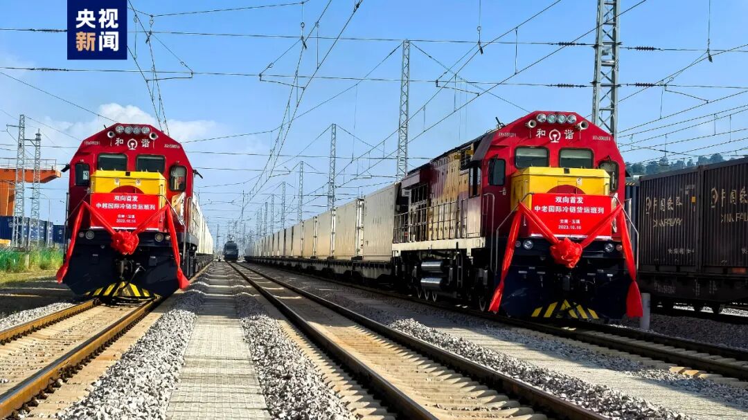16日,两列冷链班列同时从云南驶出,1天后将分别抵达老挝万象和越南老街,这标志着中老、中越铁路国际冷链货运班列正式开通运营。