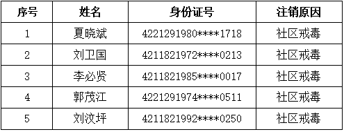 根据《机动车驾驶证申领和使用规定》公安部(第162号令)第七十九条相关规定,武穴市公安局交通警察大队现对以下5人驾驶证公告注销,请下列驾驶人于三十日内携带机动车驾驶证到武穴市公安局交通警察大队车辆管理所核实并办理相关业务。