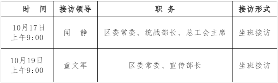为深入践行党的群众路线,加强和改进人民信访工作,进一步畅通信访渠道,黄州区安排区级领导10月份第三周接访工作。预约电话:0713-8354573。