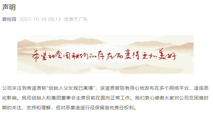 碧桂园10月19日发布声明称: