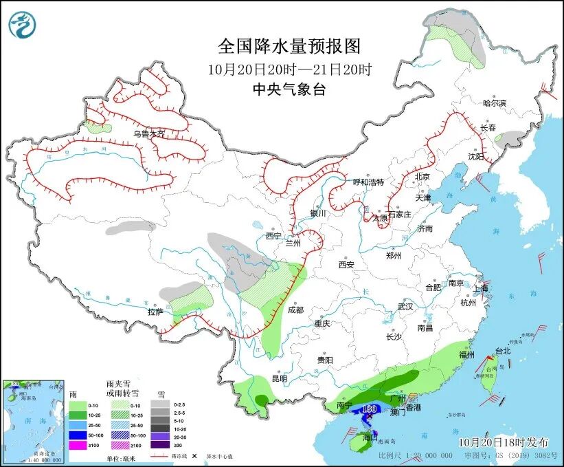 中央气象台20日18时发布暴雨蓝色预警:预计20日20时至21日20时,内蒙古东北部、黑龙江西北部、吉林东部、新疆伊犁河谷、西藏东部和北部、青海南部、川西高原等地部分地区有小雪或雨夹雪。广西东南部、广东西北部、海南岛东部等地部分地区有中到大雨。华南南部部分地区有大到暴雨。