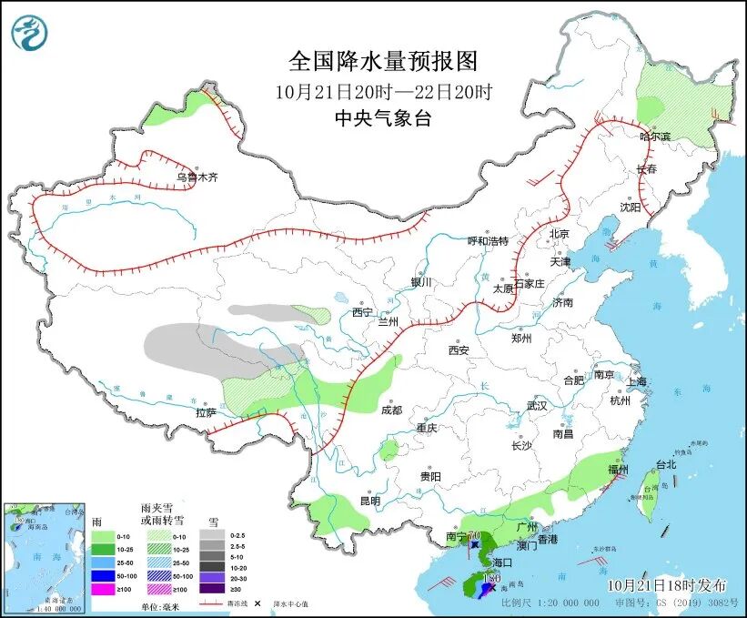 中央气象台预计,21日20时至22日20时,黑龙江大部、新疆北疆北部、西藏东部和北部、青海中部和南部等地部分地区有小雪或雨夹雪。广西东南部沿海、海南岛中东部和南部等地部分地区有大到暴雨,其中,海南岛东南部等地局地有大暴雨。