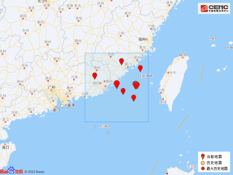 历史地震:根据中国地震台网速报目录,震中周边200公里内近5年来发生3级以上地震共23次,最大地震是2018年11月26日在台湾海峡发生的6.2级地震(距离本次震中124公里),历史地震分布如图。