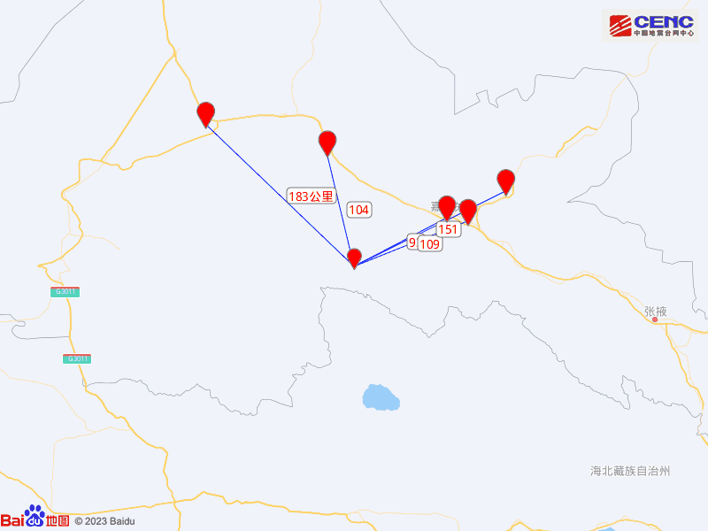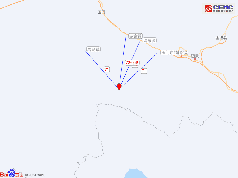 震中距嘉峪关市93公里、距玉门市104公里、距肃州区109公里、距金塔县151公里、距瓜州县183公里,距嘉峪关市93公里,距西宁市497公里。