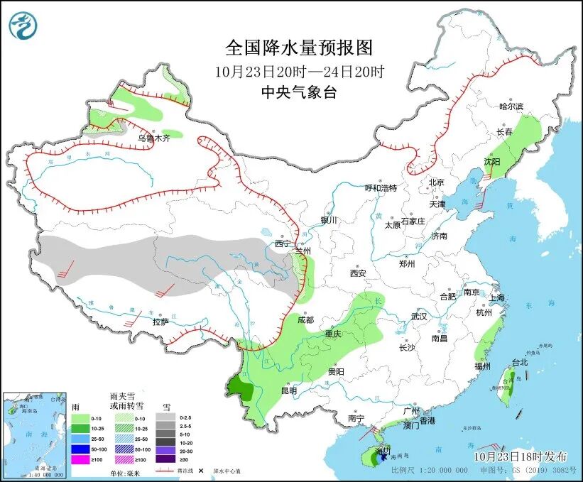 中央气象台预计,23日20时至24日20时,新疆西北部、西藏北部、青海南部、甘肃西南部、川西高原北部等地部分地区有小雪或雨夹雪;辽宁东部、吉林东部、云南中西部、四川南部、贵州西部和北部、重庆中东部、湖北西部、浙江东部、福建东北部、广东东南部沿海、海南岛、台湾岛等地部分地区有小到中雨,其中,海南岛东部局地有大到暴雨。