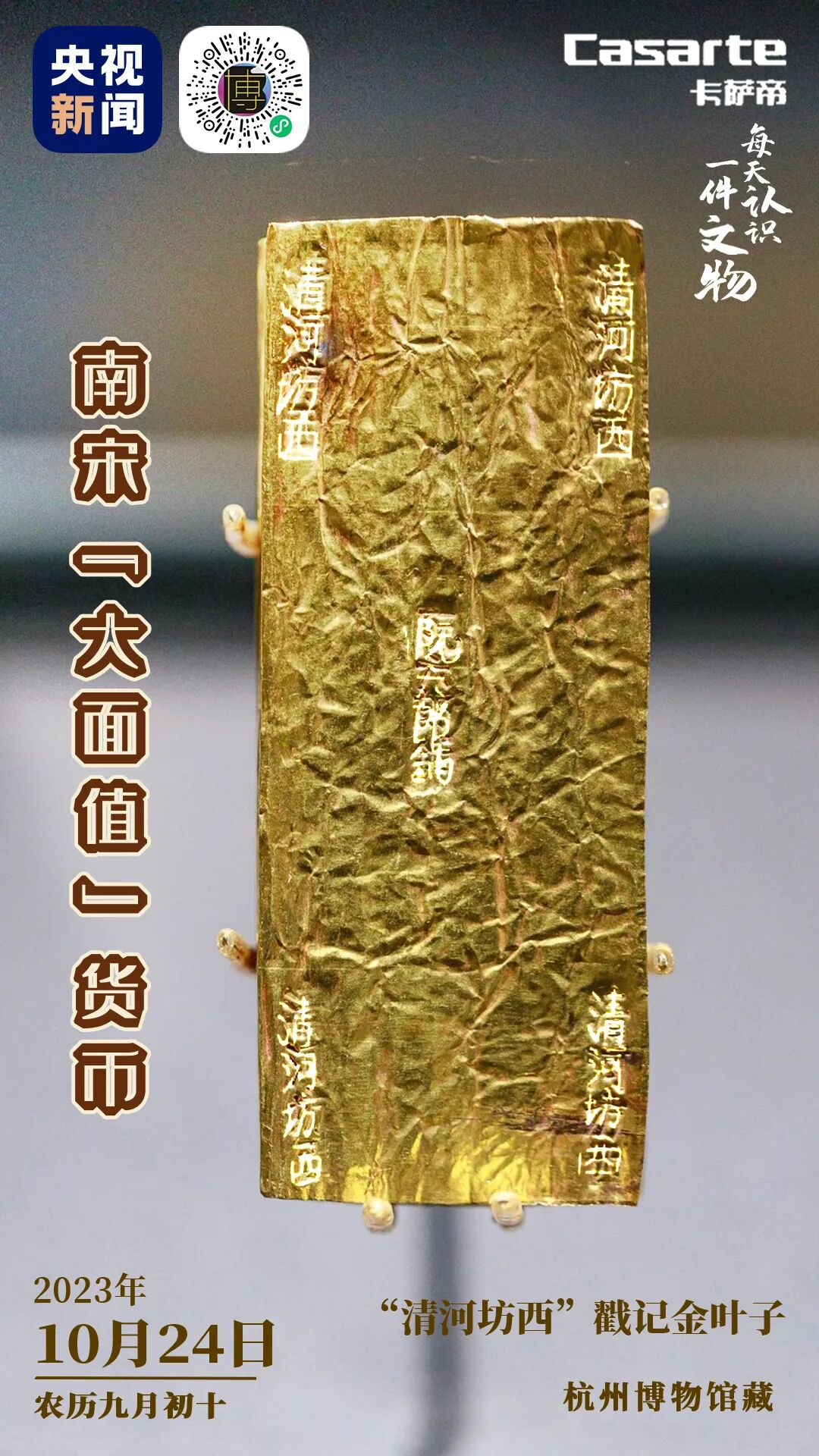 “清河坊西”戳记金叶子,是南宋的金质货币,正面第一页五处戳打铭文,其中“清河坊西”为金银铺所在地址。它的外形类似于折页,从现有出土的金叶子来看,重量在35~40克之间,在宋代约合黄金一两。