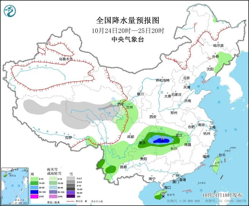 中央气象台预计,24日20时至25日20时,西藏北部、青海中南部等地部分地区有小到中雪或雨夹雪。重庆中南部、贵州北部、湖北南部、湖南北部、云南西部、海南岛东部和南部等地部分地区有中到大雨,其中,湖南北部、重庆东南部等地部分地区有暴雨。