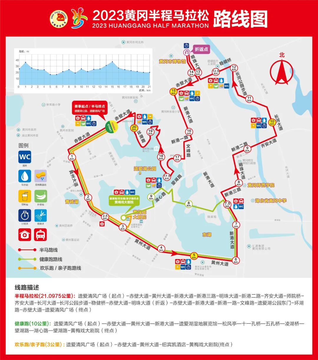 赛事的起点设在黄冈遗爱湖风景区遗爱清风广场,途经赤壁大道、黄州大道等,半程马拉松终点设在遗爱清风广场,健康跑、欢乐跑和亲子跑的终点设在黄梅戏大剧院。