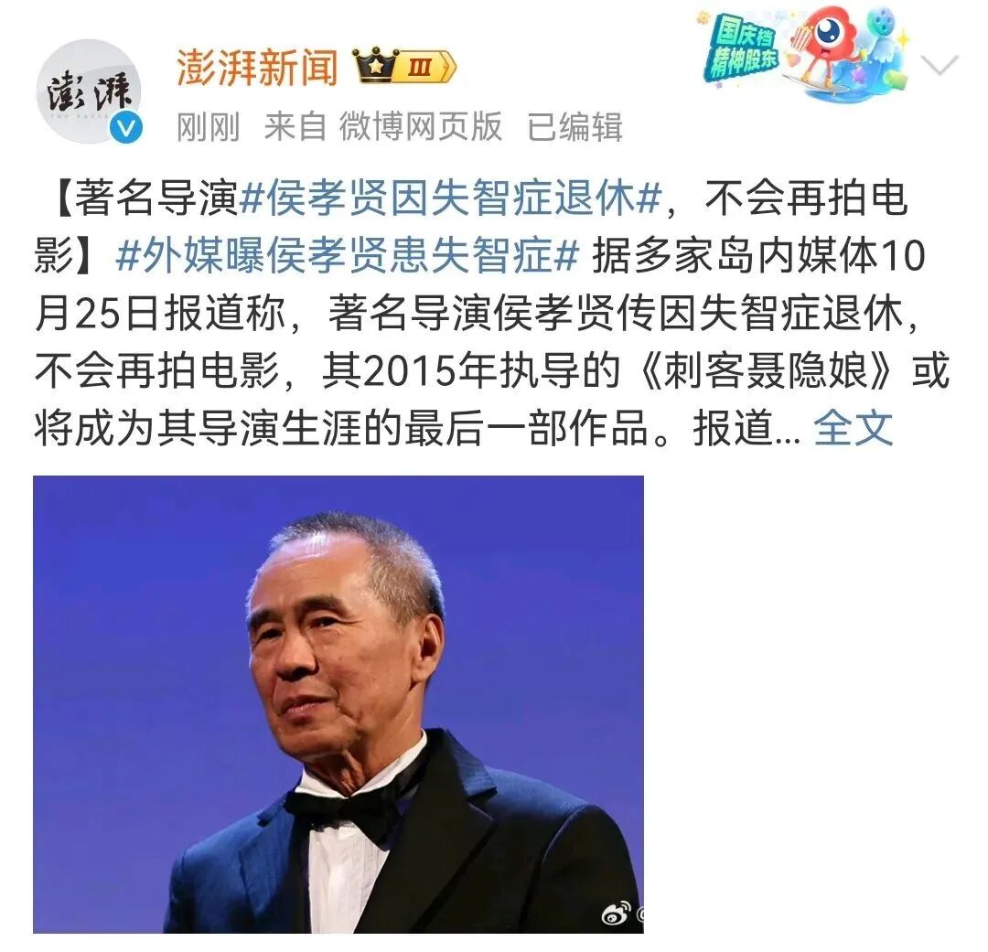 据多家媒体10月25日报道称,著名导演侯孝贤传因失智症(dementia)退休,不会再拍电影,其2015年执导的《刺客聂隐娘》或将成为其导演生涯的最后一部作品。