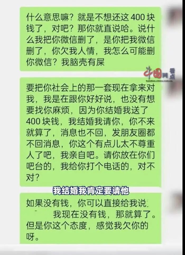 10月22日,四川绵阳一女子给前同事结婚随礼400元,自己结婚发请帖后却遭对方无视,直接提出需要还礼的请求后,前同事依旧耍赖不理。(据10月24日央视网)