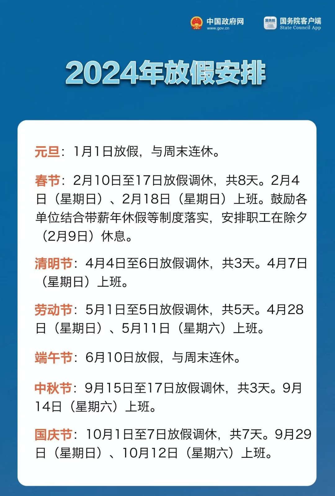 25日,2024年放假安排发布。2024年春节放假8天,国庆放假7天。