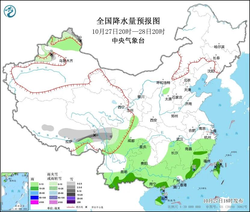 中央气象台预计,27日20时至28日20时,新疆北部、西藏东部、川西高原北部等地有小到中雪或雨夹雪,其中新疆北疆北部、西藏东部等地的部分地区有大雪;福建、云南南部、广西南部、广东东部和西南部、海南岛、台湾岛等地的部分地区有中到大雨。