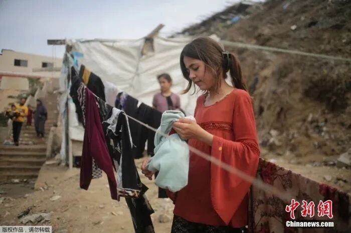 资料图:当地时间10月29日,在加沙地带中部的Deir al-Balah海滩上,由于加沙地带持续缺水,巴勒斯坦人使用海水洗浴洗衣。