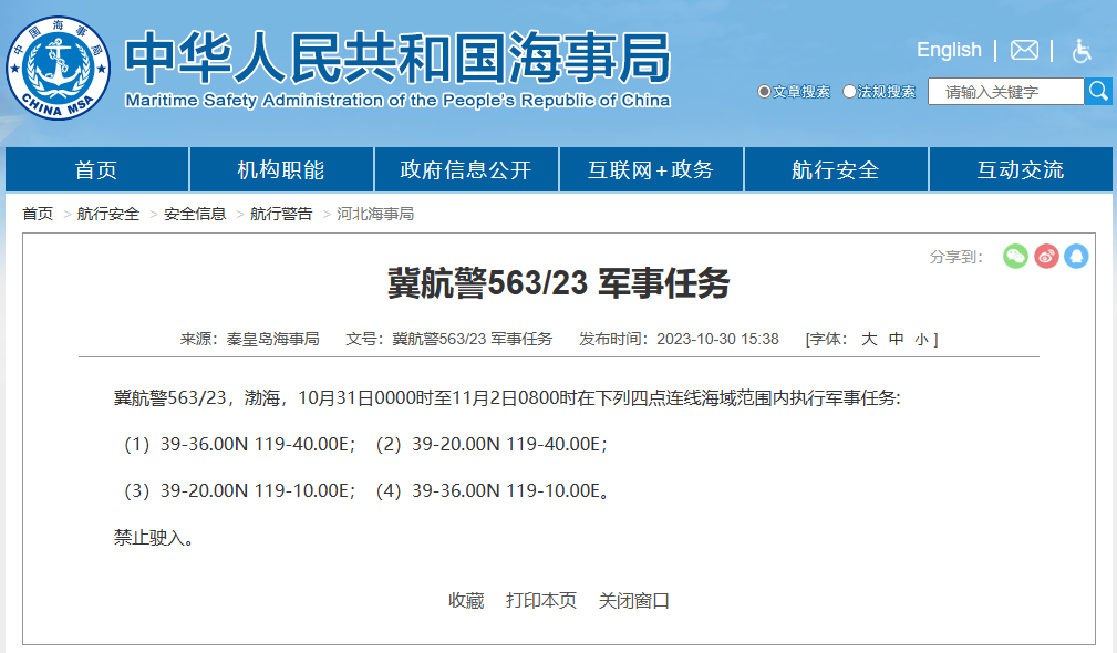 据中国海事局网站消息,秦皇岛海事局发布航行警告,10月31日0时至11月2日8时,渤海部分海域执行军事任务,禁止驶入。