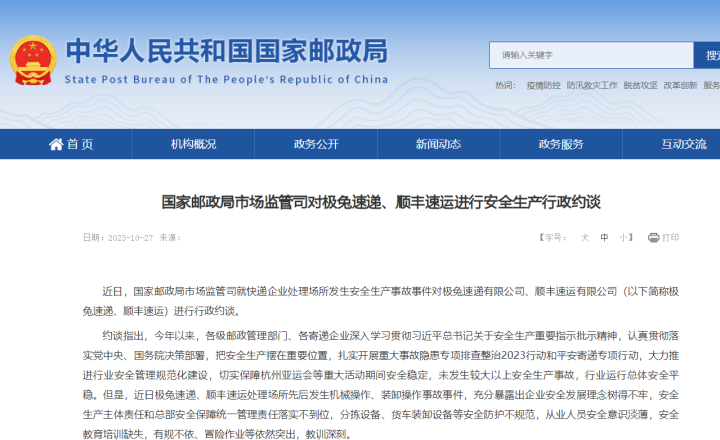 约谈指出,今年以来,各级邮政管理部门、各寄递企业深入学习贯彻习近平总书记关于安全生产重要指示批示精神,认真贯彻落实党中央、国务院决策部署,把安全生产摆在重要位置,扎实开展重大事故隐患专项排查整治2023行动和平安寄递专项行动,大力推进行业安全管理规范化建设,切实保障杭州亚运会等重大活动期间安全稳定,未发生较大以上安全生产事故,行业运行总体安全平稳。但是,近日极兔速递、顺丰速运处理场所先后发生机械操作、装卸操作事故事件,充分暴露出企业安全发展理念树得不牢,安全生产主体责任和总部安全保障统一管理责任落实不到位,分拣设备、货车装卸设备等安全防护不规范,从业人员安全意识淡薄,安全教育培训缺失,有规不依、冒险作业等依然突出,教训深刻。