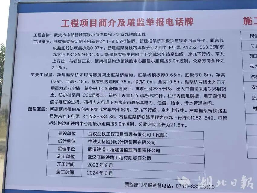 “左右两边各扩宽一个9米宽的框架桥,在保证火车行车的条件下施工,这期间涉及到的线上的安全问题,协调单位也是非常多的,我们要跟武汉的电务段、供电段、麻城的公务段和车务段等单位进行配合,协调也特别的麻烦。”武汉江腾铁路工程有限责任公司武穴高铁小镇项目技术负责人吴君强说。