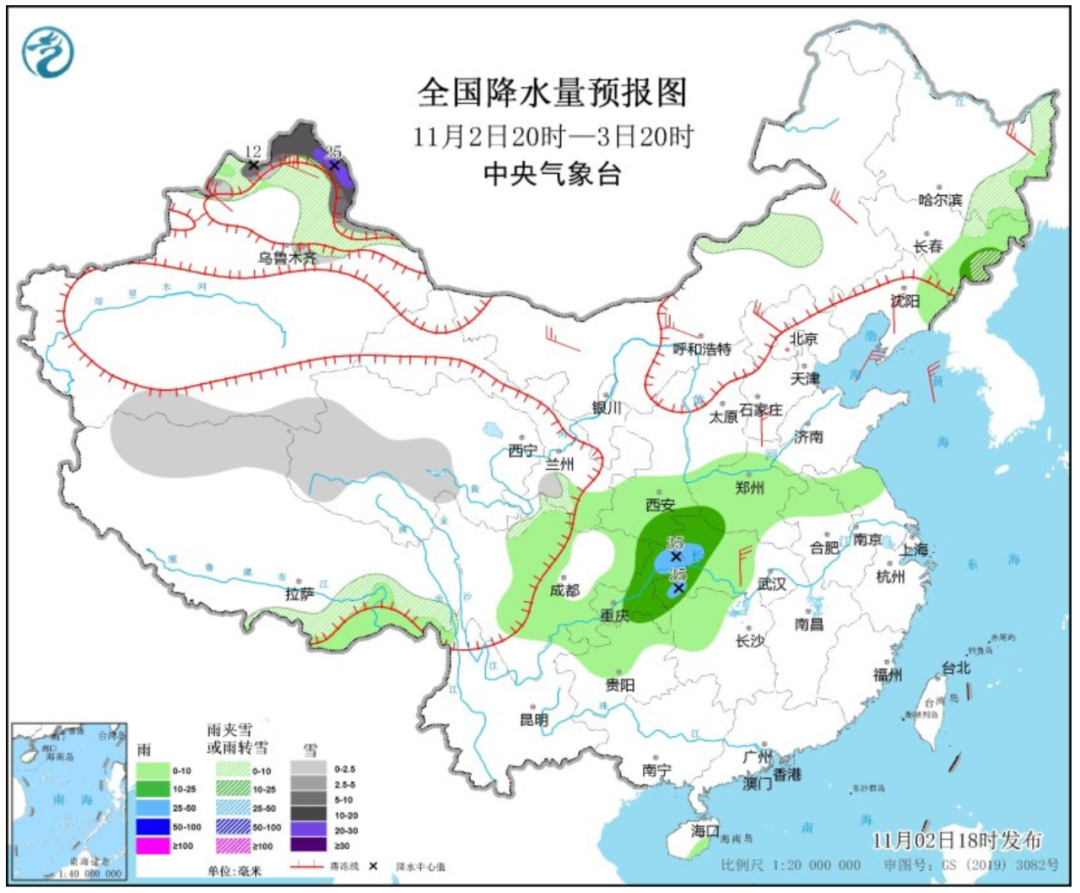 中央气象台预计,2日20时至3日20时,新疆北部、内蒙古东南部、黑龙江东部、青海西部等地部分地区有小到中雪或雨夹雪。甘肃东南部、陕西南部、吉林东部、辽宁东北部、四川中东部、重庆、贵州北部、湖北中西部、河南大部等地部分地区有小到中雨。