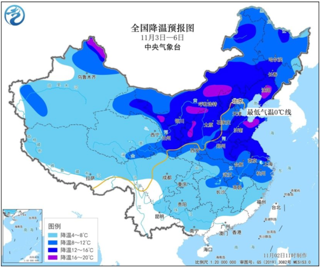 中央气象台预计,3日至6日,受冷空气影响,我国大部地区过程累计降温幅度有4—8℃,其中新疆北部、西北地区东部、华北、东北地区、黄淮、江淮东部降温10—14℃,局地可达16℃以上。