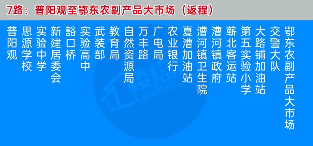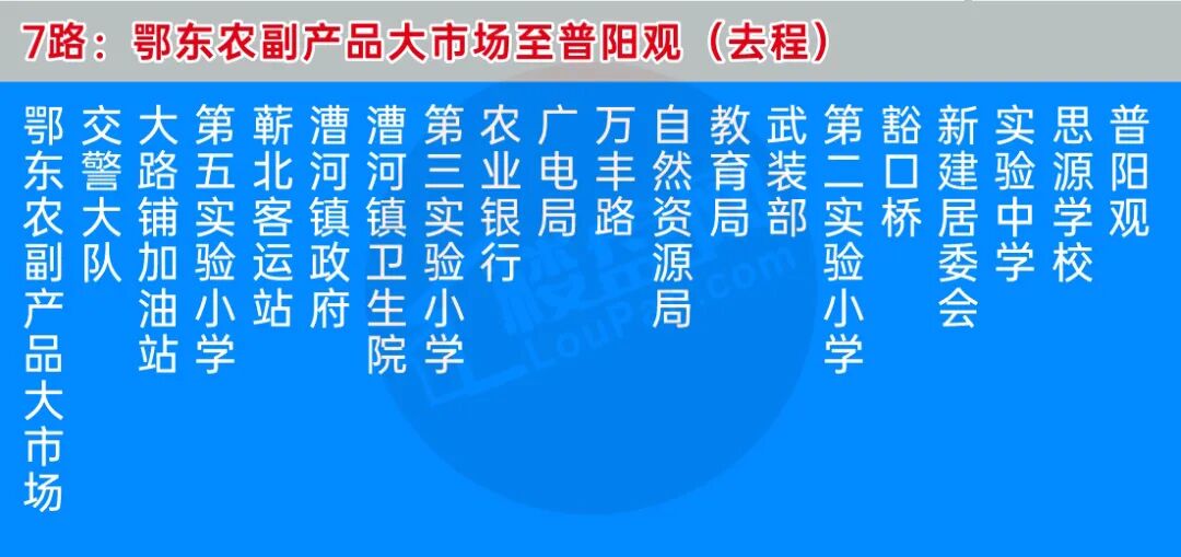 7路:普阳观至鄂东农副产品大市场(返程)普阳观→思源学校→实验中学→新建居委会→豁口桥→实验高中→武装部→教育局→自然资源局→万丰路→广电局→农业银行→夏漕加油站→漕河镇卫生院→漕河镇政府→蕲北客运站→第五实验小学→大路铺加油站→交警大队→鄂东农副产品大市场