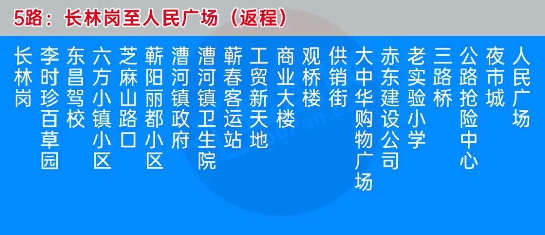 5路:长林岗至人民广场(返程)长林岗→李时珍百草园→东昌驾校→六方小镇小区→芝麻山路口→蕲阳丽都小区→漕河镇政府→漕河镇卫生院→蕲春客运站→工贸新天地→商业大楼→观桥楼→供销街→大中华购物广场→赤东建设公司→老实验小学→三路桥→公路抢险中心→夜市城→人民广场