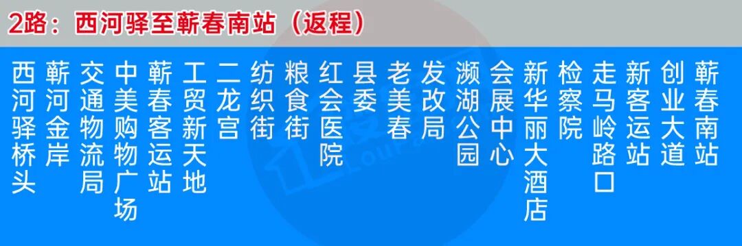 2路:西河驿至蕲春南站(返程)西河驿桥头→蕲河金岸→交通物流局→中美购物广场→蕲春客运站→工贸新天地→二龙宫→纺织街→粮食街→红会医院→县委→老美春→发改局→濒湖公园→会展中心→新华丽大酒店→检察院→走马岭路口→新客运站→创业大道→蕲春南站