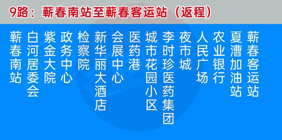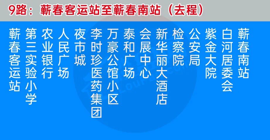 9路:蕲春南站至蕲春客运站(返程)蕲春南站→白河居委会→紫金大院→政务中心→检察院→新华丽大酒店→会展中心→医药港→城市花园小区→李时珍医药集团→夜市城→人民广场→农业银行→夏漕加油站→蕲春客运站