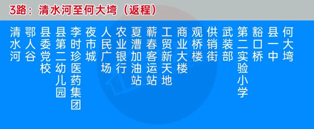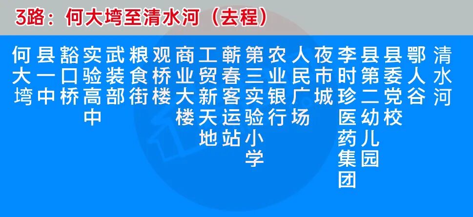 3路:何大塆至清水河(去程)何大塆→县一中→豁口桥→实验高中→武装部→粮食街→观桥楼→商业大楼→工贸新天地→蕲春客运站→第三实验小学→农业银行→人民广场→夜市城→李时珍医药集团→县第二幼儿园→县委党校→鄂人谷→清水河