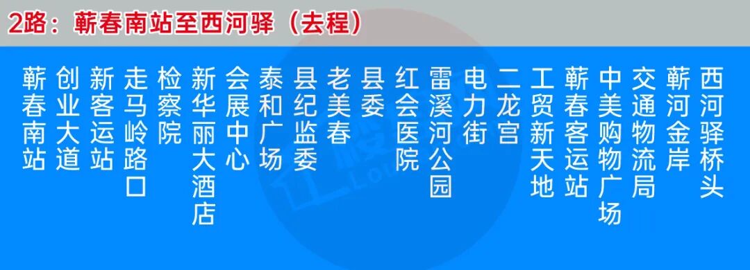 1路:火车站至新客运站(返程)火车站→农业银行→夏漕加油站→蕲春客运站→工贸新天地→商业大楼→观桥楼→供销街→大中华购物广场→信达步行街→香格里拉新城小区→供电所→付畈居委会→晶帝学府小区→李时珍中医院→走马岭→新客运站2路:蕲春南站至西河驿(去程)蕲春南站→创业大道→新客运站→走马岭路口→检察院→新华丽大酒店→会展中心→泰和广场→县纪监委→老美春→县委→红会医院→雷溪河公园→电力街→二龙宫→工贸新天地→蕲春客运站→中美购物广场→交通物流局→蕲河金岸→西河驿桥头