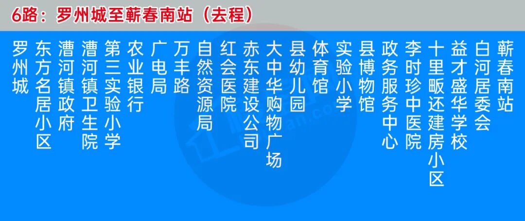 6路:罗州城至蕲春南站(去程)罗州城→东方名居小区→漕河镇政府→漕河镇卫生院→第三实验小学→农业银行→广电局→万丰路→自然资源局→红会医院→赤东建设公司→大中华购物广场→县幼儿园→体育馆→实验小学→县博物馆→政务服务中心→李时珍中医院→十里畈还建房小区→益才盛华学校→白河居委会→蕲春南站