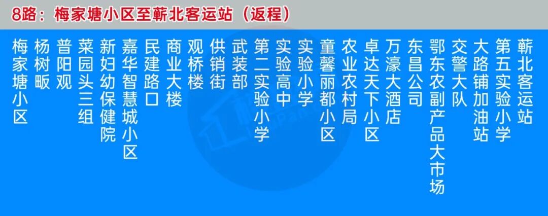 8路:梅家塘小区至蕲北客运站(返程)梅家塘小区→杨树畈→普阳观→菜园头三组→新妇幼保健院→嘉华智慧城小区→民建路口→商业大楼→观桥楼→供销街→武装部→第二实验小学→实验高中→实验小学→童馨丽都小区→农业农村局→卓达天下小区→万濠大酒店→东昌公司→鄂东农副产品大市场→交警大队→大路铺加油站→第五实验小学→蕲北客运站