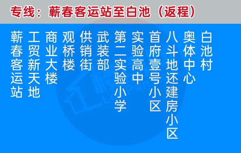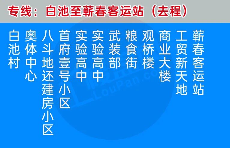 专线:白池至蕲春客运站(去程)白池村→奥体中心→八斗地还建房小区→首府壹号小区→实验高中→实验高中→武装部→粮食街→观桥楼→商业大楼→工贸新天地→蕲春客运站