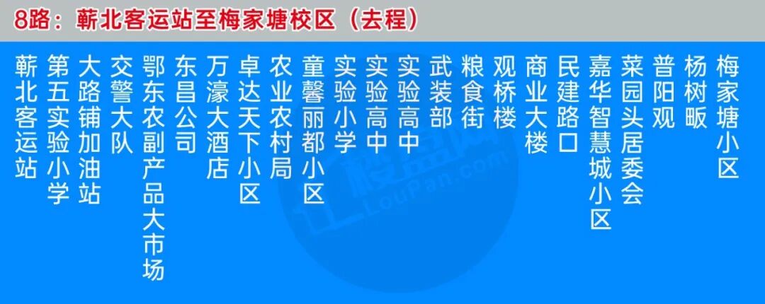 8路:蕲北客运站至梅家塘校区(去程)蕲北客运站→第五实验小学→大路铺加油站→交警大队→鄂东农副产品大市场→东昌公司→万濠大酒店→卓达天下小区→农业农村局→童馨丽都小区→实验小学→实验高中→实验高中→武装部→粮食街→观桥楼→商业大楼→民建路口→嘉华智慧城小区→菜园头居委会→普阳观→杨树畈→梅家塘小区