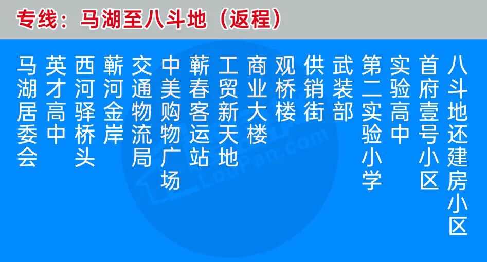 专线:马湖至八斗地(返程)马湖居委会→英才高中→西河驿桥头→蕲河金岸→交通物流局→中美购物广场→蕲春客运站→工贸新天地→商业大楼→观桥楼→供销街→武装部→第二实验小学→实验高中→首府壹号小区→八斗地还建房小区