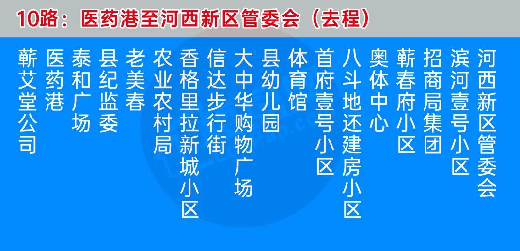 10路:医药港至河西新区管委会(去程)蕲艾堂公司→医药港→泰和广场→县纪监委→老美春→农业农村局→香格里拉新城小区→信达步行街→大中华购物广场→县幼儿园→体育馆→首府壹号小区→八斗地还建房小区→奥体中心→蕲春府小区→招商局集团→滨河壹号小区→河西新区管委会