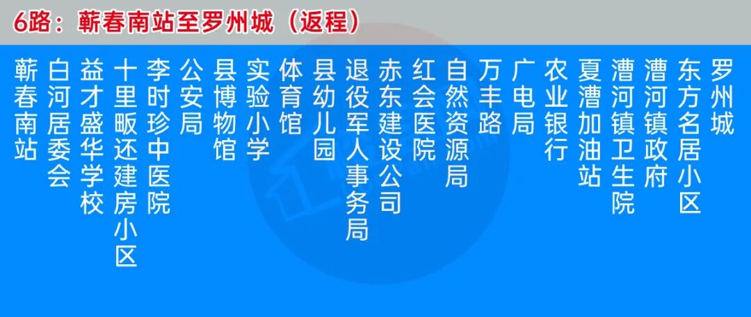 6路:蕲春南站至罗州城(返程)蕲春南站→白河居委会→益才盛华学校→十里畈还建房小区→李时珍中医院→公安局→县博物馆→实验小学→体育馆→县幼儿园→退役军人事务局→赤东建设公司→红会医院→自然资源局→万丰路→广电局→农业银行→夏漕加油站→漕河镇卫生院→漕河镇政府→东方名居小区→罗州城
